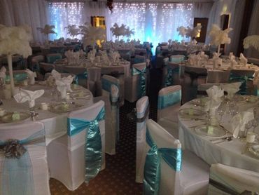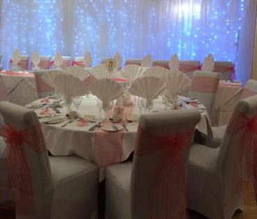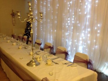 Our hassle free dressing service will ensure your chairs are dressed to perfection, our eye catching twinkle light backdrop with matching top and cake table skirts are sparkling away, whether its with warm white lights or our new mutli coloured light.