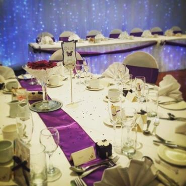 Our twinkle light backdrops are perfect for creating a magical atmosphere. The matching cake and top table skirts add the finishing touch.